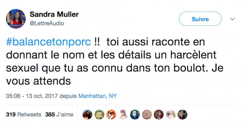 Un appel à dénoncer le harcèlement sexuel au travail est devenu viral sur Twitter ce week-end, sous le hashtag #balancetonporc, donnant lieu à de multiples témoignages visant des agresseurs quasi-exclusivement anonymes, dans la foulée du scandale Weinstein aux Etats-Unis. Cet appel, évoqué par plusieurs médias, a été initié vendredi par une journaliste travaillant pour la Lettre de l'audiovisuel, Sandra Muller. Dans son tweet, celle-ci invite à raconter, "en donnant le nom et les détails, un harceleur sexuel que tu as connu dans ton boulot". Ce lundi 16 octobre 2017,