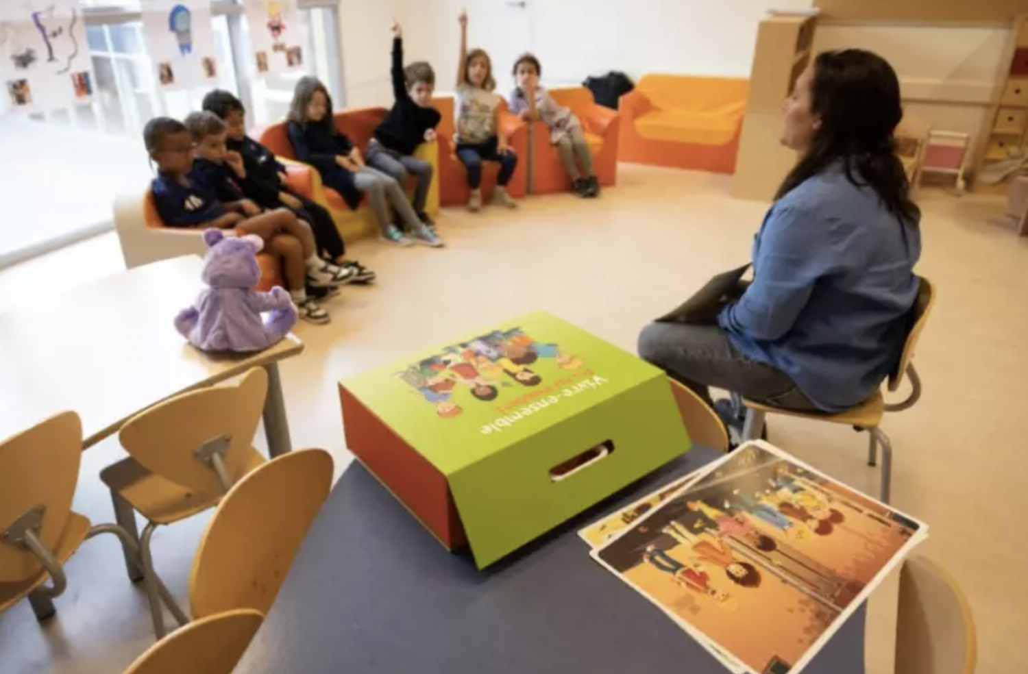 D'une valise colorée, l'animatrice extrait une peluche - "calinours", le confident à qui les enfants se confient - ainsi qu'une image, représentant un garçon en train de raturer le dessin de son camarade contrarié.