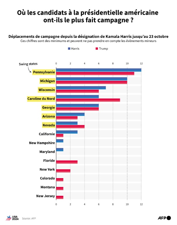 Kamala Harris multiplie mercredi les kilomètres et les meetings dans les "swing states", ces Etats décisifs pour la présidentielle américaine, au lendemain de son meeting géant à Washington ayant servi de "réquisitoire final" contre Donald Trump.