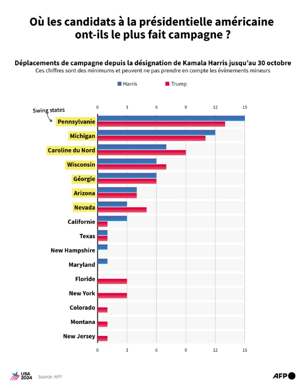 Les derniers sondages donnent les deux adversaires quasiment à égalité dans les sept Etats cruciaux, ceux qui, dans ce scrutin au suffrage indirect, donneront à la démocrate ou au républicain le nombre suffisant de grands électeurs pour atteindre le seuil de 270 sur 538, synonyme de victoire.