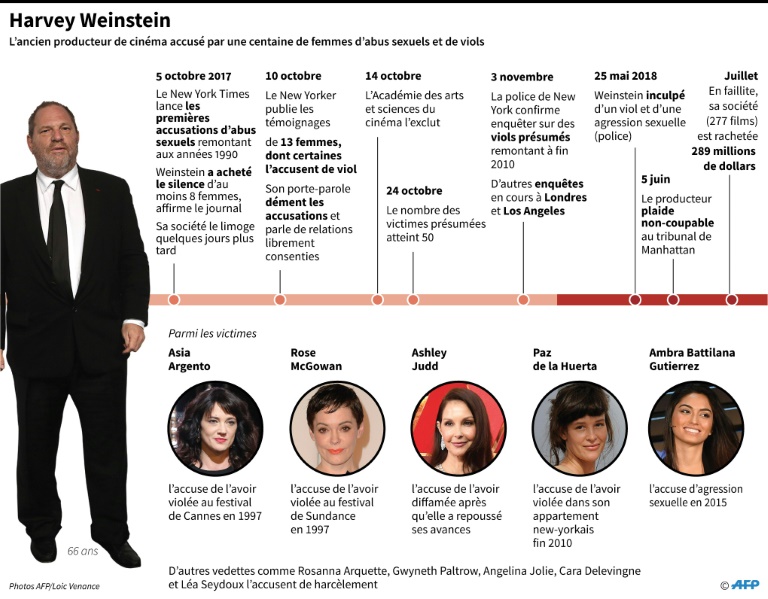 Il aura suffi de quelques mois pour que la carrière du magnat d'Hollywood, rattrapé par la réalité, soit réduite à néant. A 66 ans, il est aujourd'hui honni de tous, en passe d'être ruiné par ses turpitudes et réduit à porter un bracelet électronique. L'image restera représentative du mouvement #MeToo, catalysé par ces révélations du 5 octobre 2017: la carrure imposante d'Harvey Weinstein, sortant menotté d'un commissariat de Manhattan le 25 mai 2018 avant d'être inculpé pour le viol d'une femme et une agression sexuelle sur une autre. Une troisième inculpation pour agressions sexuelles s'est depuis ajoutée à la liste.