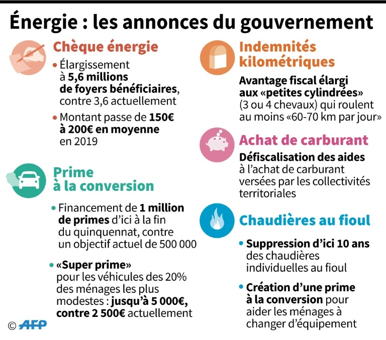 Inflexible sur la taxe carbone - et notamment sur les carburants - Edouard Philippe a proposé la mise en place d'une surprime (pouvant aller jusqu'à 4.000 euros) à la conversion pour les foyers modestes ou les gros rouleurs, l'élargissement du chèque énergie, un dispositif d'aide pour les dépenses d'électricité et de gaz.