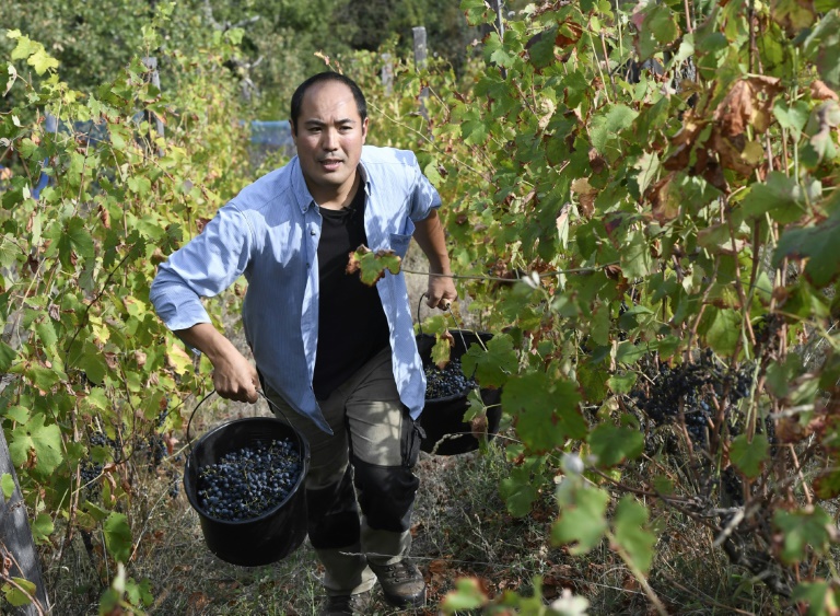 En contre-bas de sa parcelle, trois vendangeurs récoltent, essoufflés, le raisin à la main, triant grain par grain les grappes sur un coteau tombant à pic. "On peut pas faire une bonne purée avec des patates pourries", dit-il dans un français presque parfait.