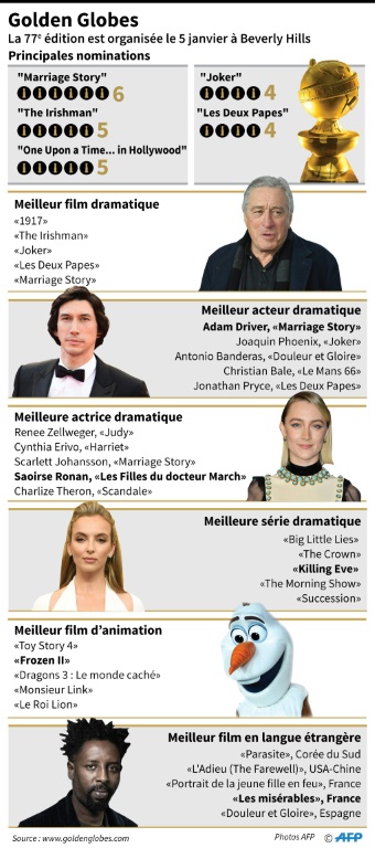 La France sera elle représentée aux Golden Globes par le drame historique "Portrait de la jeune fille en feu" de Céline Sciamma, dans la catégorie du meilleur film en langue étrangère. "Les Misérables" de Ladj Ly, prix du jury au dernier festival de Cannes, est également en lice. Mais beaucoup estiment que "Parasite", du Sud-coréen Bong Joon-ho, grand vainqueur à Cannes, devrait l'emporter dans cette catégorie.