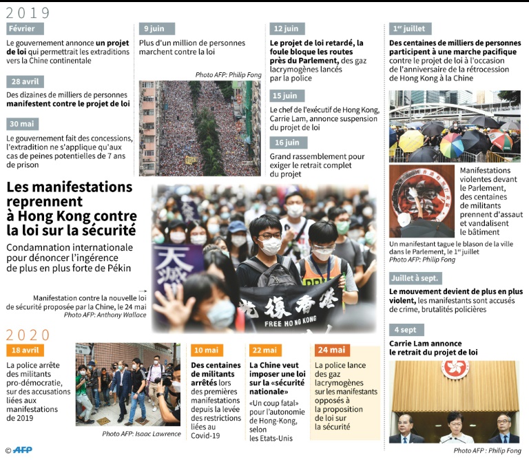 Une petite centaine de militants qui scandaient des slogans dans un quartier commercial vers midi ont été dispersés par des tirs de gaz poivré, ont constaté des journalistes de l'AFP sur place. Le débat devant le Conseil législatif (LegCo) de ce texte, accusé par le mouvement pro-démocratie de porter atteinte à la liberté d'expression, intervient après la décision de la Chine d'imposer à Hong Kong une loi sur la sécurité nationale.