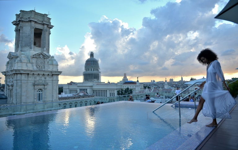 La grande terrasse offre une vue imprenable sur le quartier historique et coloré de La Havane, où nombre de Cubains vivent dans des immeubles délabrés, parfois envahis par la végétation. "Là je n'ai pas du tout l'impression d'être à Cuba, clairement pas... peut-être plus aux Etats-Unis, à Miami ou à Puerto Rico", confie au bord de la piscine Celia Liégeois, 26 ans, venue de Paris et vêtue d'un paréo aux couleurs du drapeau cubain.