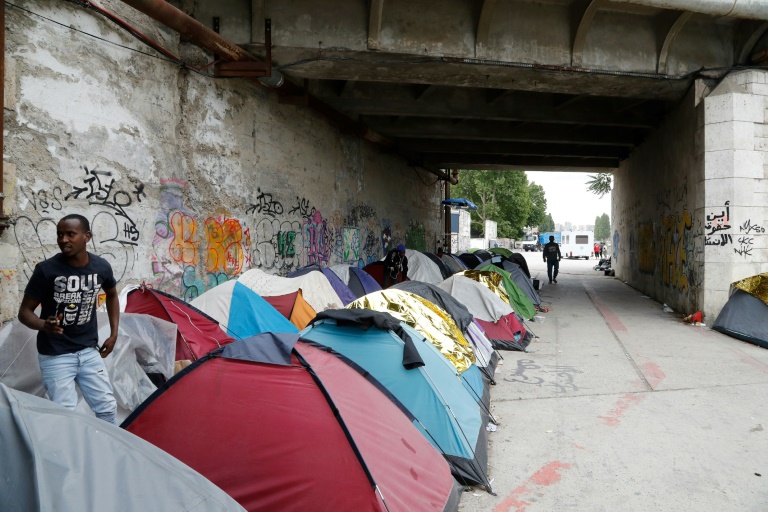 Derrière lui, des dizaines de tentes s'étendent de part et d'autre de ce canal qui délimite Paris de la Seine-Saint-Denis. Certaines sont disposées en terrasse sur la berge, d'autres à l'ombre sous le pont de Stains, à Aubervilliers, qui accueille le gros de ce campement en pleine expansion.