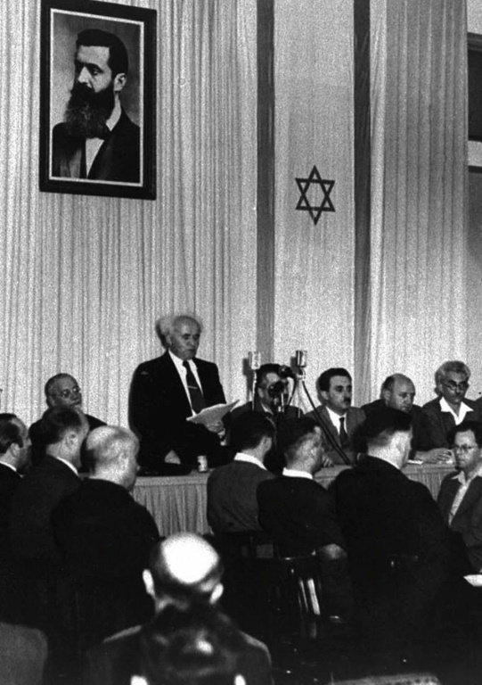 Le 14 mai 1948, David Ben Gourion proclame la création de l'Etat d'Israël aussitôt après la fin du mandat britannique sur la Palestine.