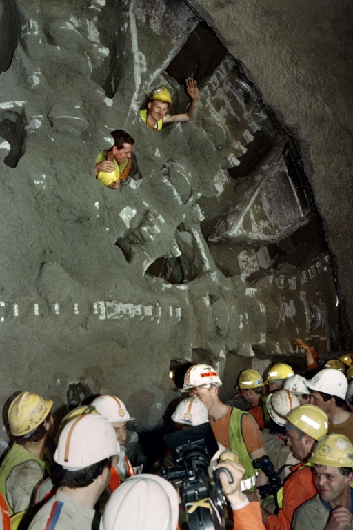 Le 1er décembre 1990, "à 12h12", deux ouvriers, le Francais Philippe Cozette et le Britannique Robert Graham Fagg percent un premier trou à travers la craie gris-bleu. Leur photo, drapeau à la main, fait le tour du monde.