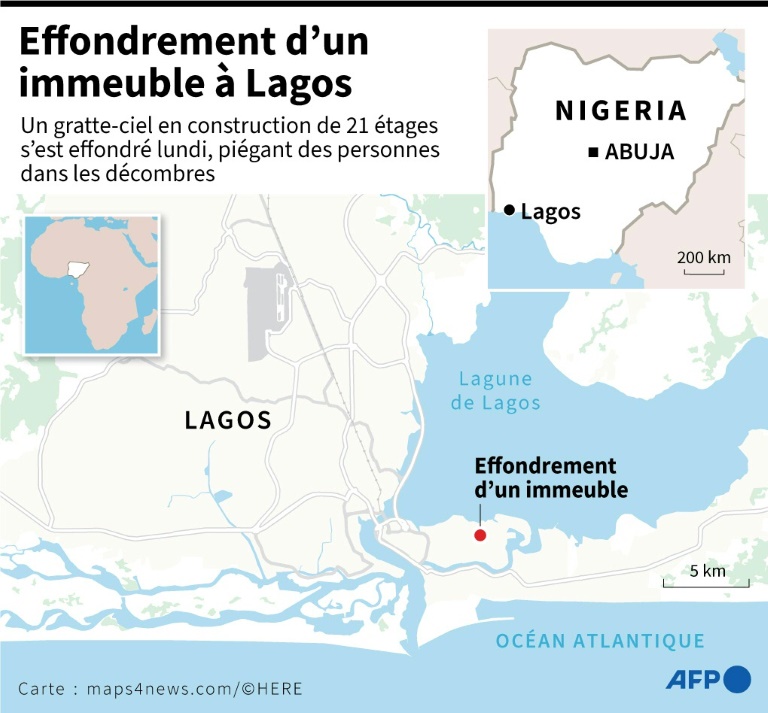 Les services de secours nigérians ont extrait mardi deux survivants des décombres du gratte-ciel en construction qui s'est effondré lundi à Lagos, la capitale économique du Nigeria, faisant au moins sept morts et piégeant des dizaines d'ouvriers.