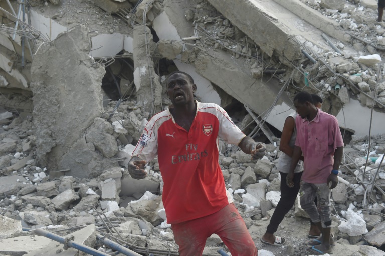 L'effondrement de bâtiments est une tragédie fréquente au Nigeria, le pays le plus peuplé d'Afrique, où des millions de personnes vivent dans des immeubles délabrés et où la législation concernant la construction est régulièrement bafouée. Assis près de la montagne de gravats de plus de dix mètres de hauteur, les frères Fawas Sanni, 21 ans, et Afolabi Sanni, 17 ans, attendent en état de choc des nouvelles de leur soeur. "Notre soeur est à l'intérieur", se lamente Fawas, une larme coulant sur la joue.