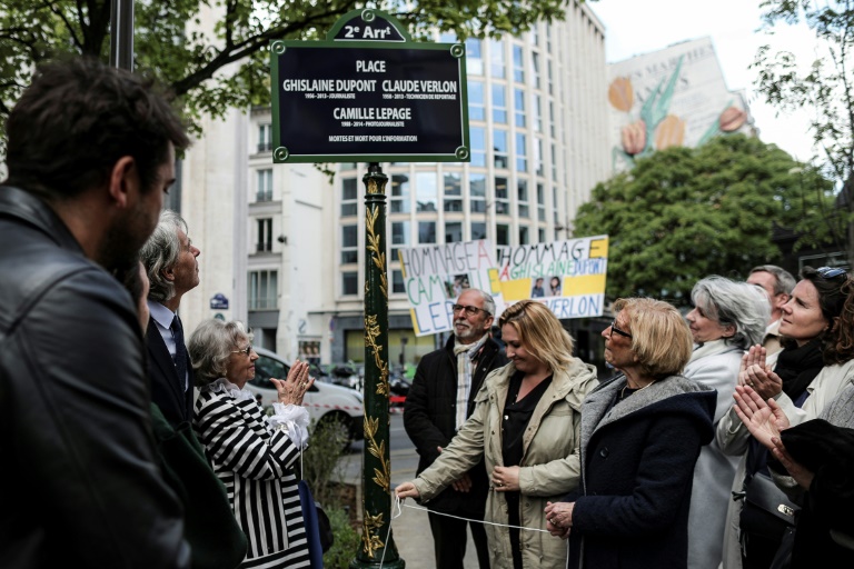 La petite place à l'intersection des rues d'Aboukir, du Louvre et Montmartre dans le IIe arrondissement, quartier emblématique de la presse, est désormais nommée "Ghislaine Dupont - Claude Verlon - Camille Lepage". Après avoir dévoilé le nom de la plaque, les familles et proches des journalistes n'ont pu retenir leurs larmes après le dévoilement de la plaque, sur laquelle on peut lire "Mortes et mort pour l'information".