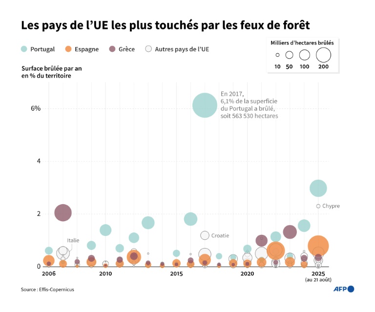 Les incendies ont déjà ravagé plus d'un million d'hectares (10.000 km2) dans l'Union européenne depuis le début de 2025, une année d'ores et déjà record, alors que plusieurs feux continuent de sévir particulièrement en Espagne et au Portugal.