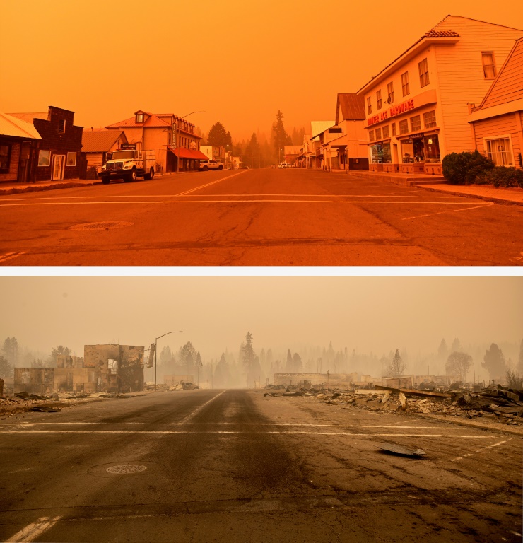 Les stigmates de cet incendie, baptisé Dixie Fire, sont visibles sur une série de clichés réalisés par un photographe de l'AFP avant et après le sinistre, qui a détruit des centaines de bâtiments et provoqué l'évacuation de milliers d'habitants dans le nord de la Californie. "J'ai observé, sous le choc, comment un bureau de poste, une caserne de pompiers, une banque, un musée et d'innombrables commerces ont été incinérés et réduits à un tas de décombres fumants", raconte ce photographe, Josh Edelson. "Des animaux morts gisaient sur le bord des routes", écrit-il.