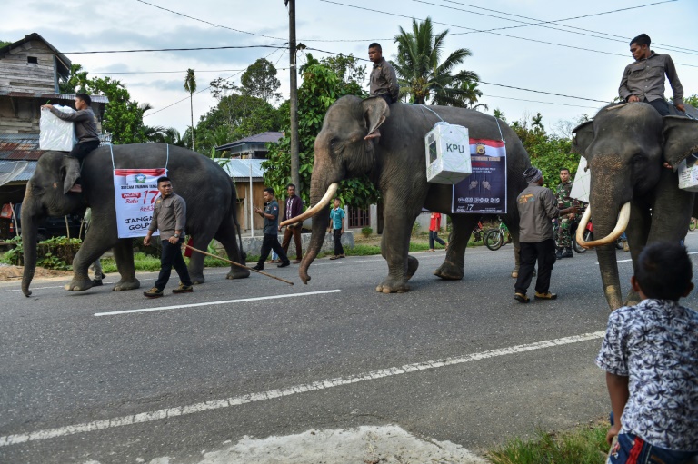 A Trumon dans la province d'Aceh, les autorités ont eu recours à trois élephants pour transporter les urnes jusqu'au bureau de vote afin d'inciter les électeurs à ses déplacer.