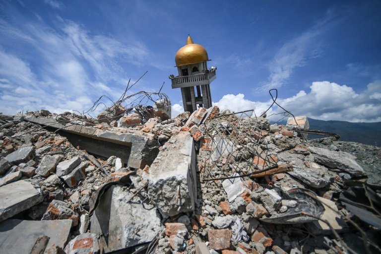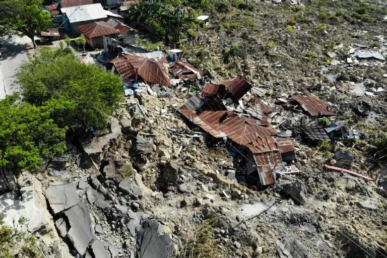 Dans le vaste complexe résidentiel gouvernemental de Balaroa, où les bâtiments ont été rasés et la terre s'est un temps "liquéfiée", des soldats munis de masques grimpent sur des décombres formant une montagne de boue, de briques et de ciment.