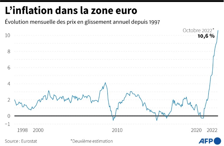 Cela s'est traduit par une poussée de l'inflation tout au long de l'année, avec par exemple +10,6% en octobre sur un an en zone euro, soit la plus forte progression depuis le démarrage de cet indice en 1997.