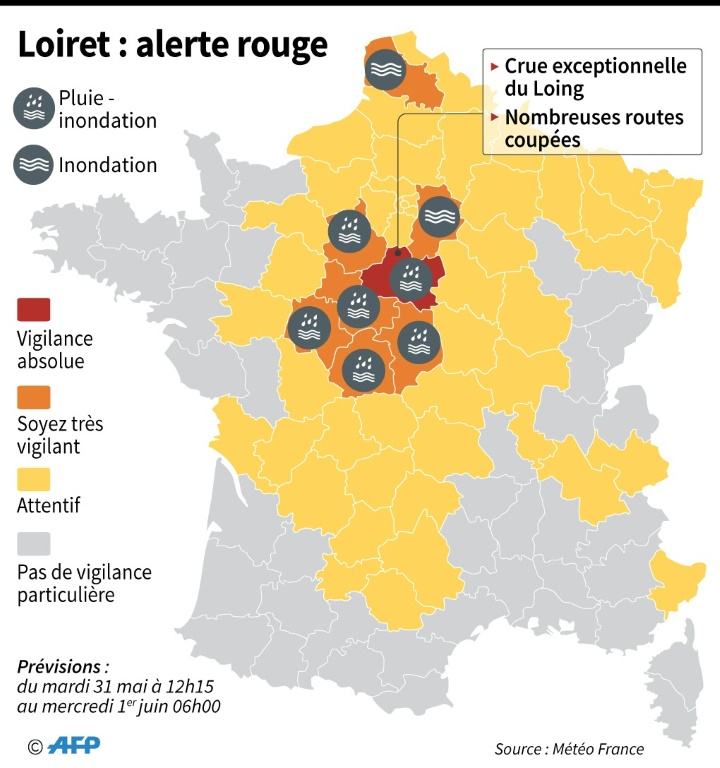 Dans la soirée, la plupart des rues du centre-ville étaient interdites à la circulation automobile et une grande partie avaient les pieds dans l'eau, et même, parfois bien plus: jusqu'à 1m80 devant la sous-préfecture, selon M. Digeon. "Le Loing, qui d'ordinaire a une hauteur de 50 cm au coeur de la ville, a atteint 3m50", a-t-il précisé.
