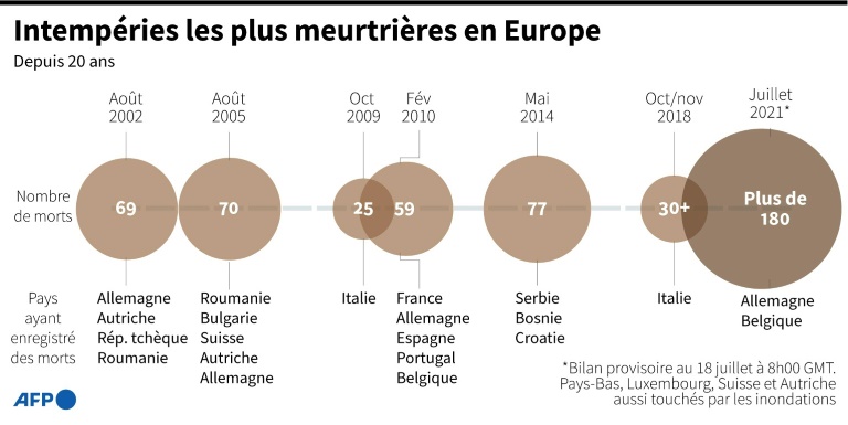 Dans la région de Rhénanie-Palatinat, la plus touchée par le sinistre, "le nombre des morts est désormais à 117", contre 112 dénombrés auparavant, "et il y a 749 blessés", a indiqué à l'AFP Verena Scheuer, une porte-parole de la police de Coblence. En Rhénanie-du-Nord-Westphalie, le dernier bilan dimanche faisait état d'"au moins" 47 morts, tandis qu'un décÚs était à déplorer en BaviÚre, au sud du pays, touchée par d'importantes crues ce week-end.