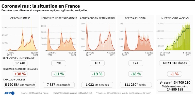 Le gouvernement s'inquiète d'un ralentissement du rythme des vaccinations même si une remontée des prises de rendez-vous a été constatée ces derniers jours. Au total, 52,1% de la population, soit 35,1 millions de personnes, ont reçu au moins une injection, et 38,3% (25,8 millions) sont complètement vaccinés, a indiqué mercredi la Direction générale de la santé. L'objectif des autorités est de vacciner 40 millions de Français en première injection d'ici fin août et de parvenir à 35 millions de schémas vaccinaux complets, soit les deux tiers des adultes.