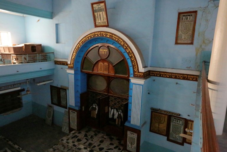 Les marches menant au tabernacle en bois se disloquent. Flanquée de plaques en marbre gravées de candélabres à sept branches et de psaumes, l'armoire abrite les rouleaux des Sefer Torah, calligraphiés à la main sur du cuir de gazelle. "Avant on priait ici, on célébrait nos fêtes, on suivait pendant l'été les cours de religion en hébreu", se souvient un membre de la communauté, évoquant la synagogue cadenassée.