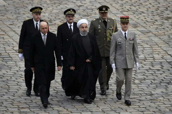 Pour cette première visite en France d'un président iranien depuis Mohammad Khatami, qui est aussi la première grande visite bilatérale de M. Rohani en Europe - il s'est rendu à Rome avant Paris -, les autorités françaises lui ont rendu les honneurs militaires sur la place des Invalides à Paris, en présence du chef de la diplomatie Laurent Fabius.