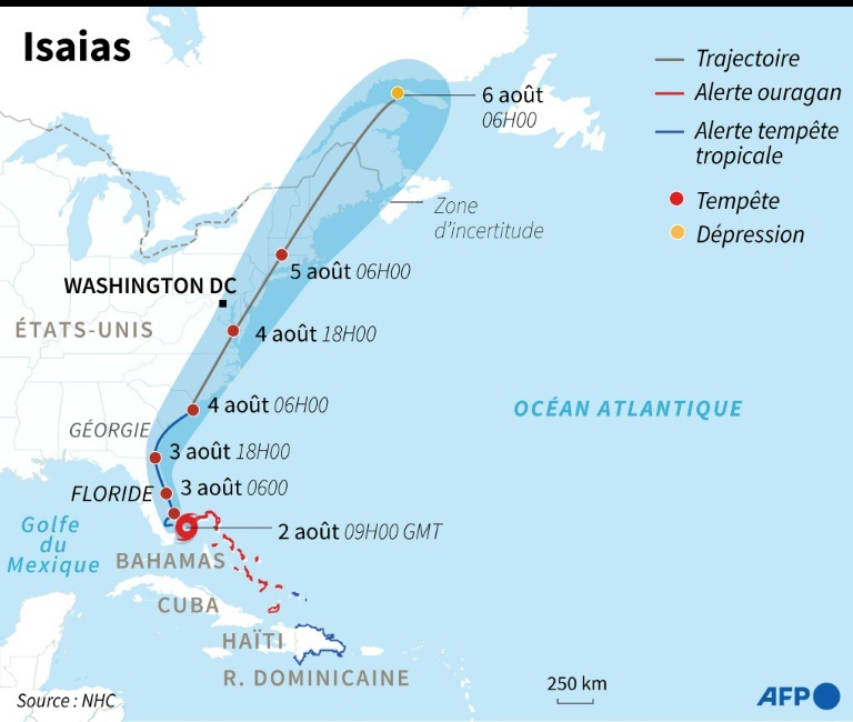A 20h00 locales (lundi 00h00 GMT), la tempĂȘte se trouvait Ă quelque 90 kilomĂštres du centre spatial amĂ©ricain de Cape Canaveral, se dirigeant vers le nord-ouest Ă la vitesse de 13 km/h environ, selon l'institut mĂ©tĂ©orologique. Isaias devait se dĂ©placer "prĂšs ou au-dessus de la cĂŽte est de la Floride aujourd'hui (dimanche) jusqu'Ă tard ce soir" avant de revenir lundi et mardi dans l'Atlantique, selon le NHC.