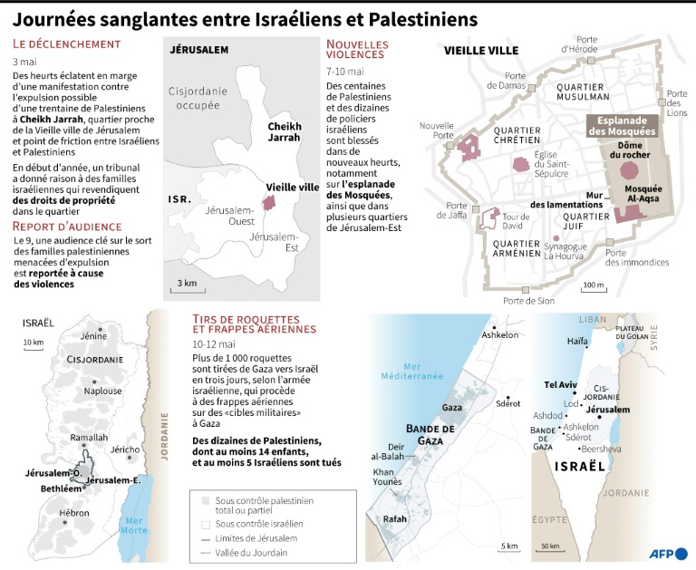 En coulisses, l'ONU, le Qatar et l'Egypte s'activent aussi pour faciliter une médiation, le chef de la diplomatie égyptienne ayant contacté son homologue israélien pour tenter en vain pour l'instant de le convaincre de cesser les frappes sur la bande de Gaza. Le Hamas avait lancé une première salve de roquettes vers Israël en guise de "solidarité" avec les plus de 700 Palestiniens blessés dans des heurts avec la police israélienne sur l'Esplanade des mosquées, troisième lieu saint de l'islam situé à Jérusalem-Est, portion de la ville sainte conquise par Israël en 1967.
