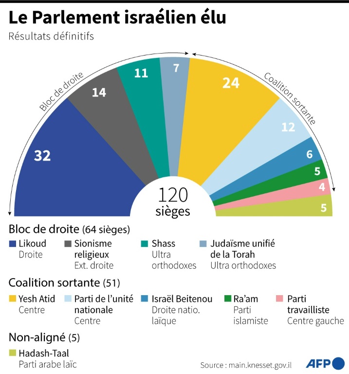 La cérémonie d'investiture, qui doit débuter à 16H00 (14H00 GMT), se tiendra ainsi dans une Knesset aux rangs de gauche clairsemés. Le parti Meretz, qui disposait de six sièges sous l'ancienne mandature, n'a pas atteint le seuil d'éligibilité et sera pour la première fois absent de l'hémicycle. Le parti travailliste est lui passé de sept à quatre sièges.