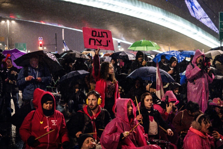 Jeudi soir, plusieurs milliers de personnes ont bravé la pluie et le vent pour manifester devant la résidence privée de M. Netanyahu à Jerusalem, puis devant la Knesset, le Parlement israélien, où les ministres étaient réunis.