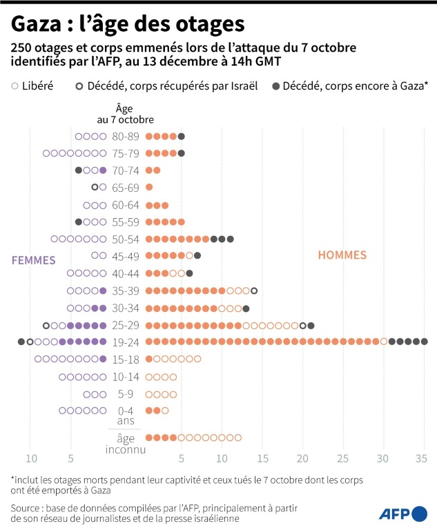 Quelque 240 personnes ont aussi été enlevées et emmenées à Gaza le jour de l'attaque, dont 135, selon l'armée, sont toujours aux mains du Hamas et de groupes affiliés après la libération de 105 otages pendant une trêve de sept jours qui a pris fin le 1er décembre.