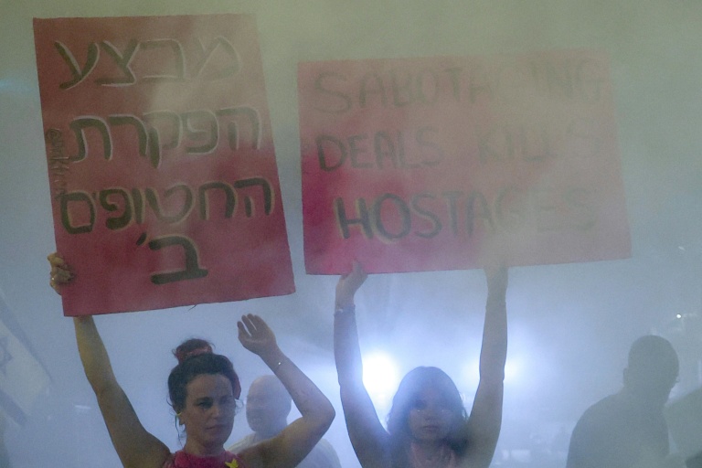 Au même moment, des dizaines de milliers d'Israéliens manifestaient, comme chaque samedi soir, à Tel-Aviv en soutien aux otages et pour exiger du gouvernement la fin de la guerre et un accord permettant leur libération.