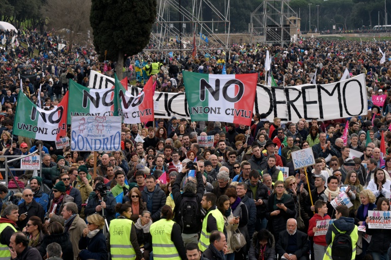 Des milliers d'opposants aux unions civiles pour les couples de même sexe ont commencé à se rassembler samedi à Rome pour manifester leur opposition à une proposition de loi actuellement discutée au Parlement.