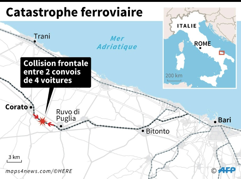 L'erreur humaine semble ĂȘtre Ă l'origine de la catastrophe ferroviaire qui a fait au moins 23 morts dans le sud de l'Italie, mĂȘme si le chef de gare mis en cause se dĂ©fend d'ĂȘtre le seul responsable<br>"C'est moi qui ait fait partir ce train, c'est moi qui ait levĂ© le disque vert, il y avait de la confusion, les trains Ă©taient en retard", a dĂ©clarĂ© Vito Piccarreta, le chef de la gare d'Andria, citĂ© par les mĂ©dias.