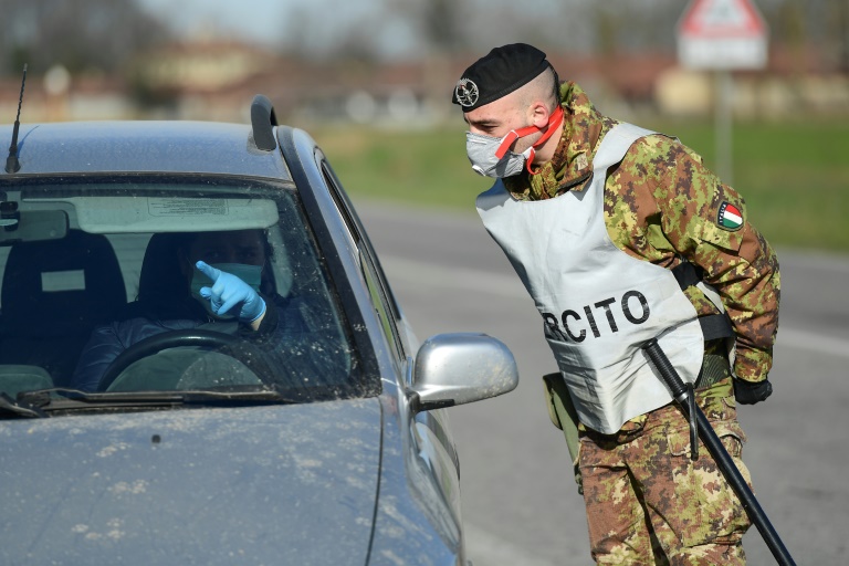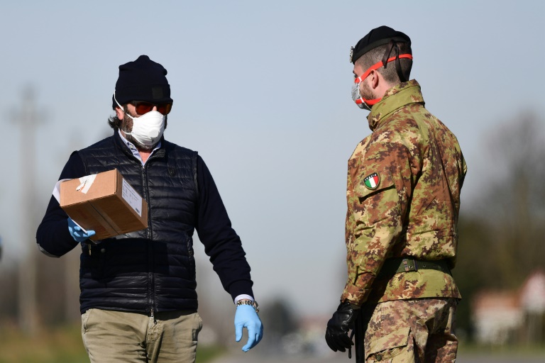 Salvatore, habillé de la tête au pied en tenue de cycliste, plaisante avec les militaires du barrage. Lui-même est carabinier -et pour cette raison refuse de donner son nom de famille-, coincé à Bertonico en zone rouge, où il continue pourtant de patrouiller le soir. "J'attends mes collègues de Lodi qui vont m'apporter des cigarettes. Dans la zone rouge, à part les magasins d'alimentation et les kiosques à journaux, tout est fermé", explique-t-il.