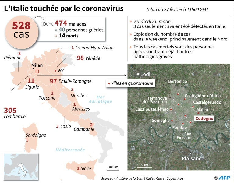Mais l'inquiétude grandit - "pas à cause du virus, après tout c'est comme une mauvaise grippe, non ?" - mais en raison des répercussions économiques. Pietro Mola travaille pour 16 entreprises: restaurants, boutiques textiles, pierceur, tatoueurs... Tous dans la zone rouge, tous fermés. "C'est une chaîne. S'ils ne gagnent pas, je ne gagne pas. Les entreprises qui n'ont pas les reins solides ne vont pas s'en sortir", s'inquiète le jeune comptable, en pensant aux dix jours de quarantaine durant lesquels il faut encore tenir.