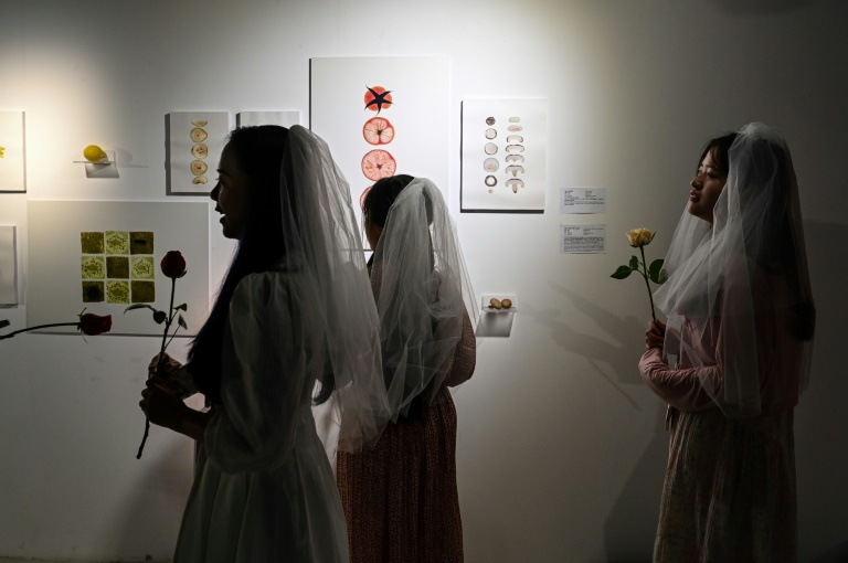 L'exposition de Shanghai entend rĂ©pondre Ă ces stĂ©rĂ©otypes, avec notamment une parodie de mariage par des jeunes femmes qui cĂ©lĂšbrent ainsi l'acceptation de leur corps. "On a toujours cru qu'on avait un corps plein de dĂ©fauts", explique Zhang Qinwen, voile de mariĂ©e sur la tĂȘte. "Avec ce mariage fictif qu'on organise aujourd'hui, on veut montrer qu'on s'aime vraiment comme on est."