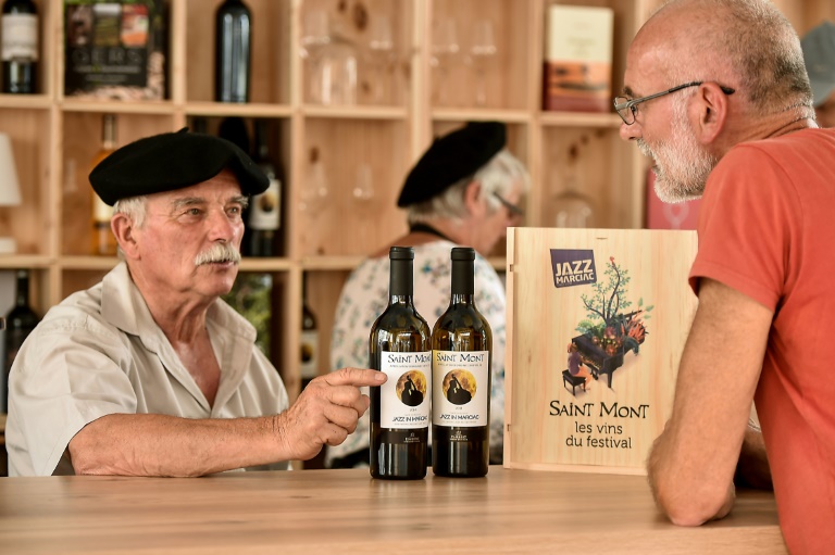 Sur l'étiquette des bouteilles, la silhouette d'un contrebassiste se détache: pour l'occasion, l'AOC "Saint Mont" a sorti une bouteille spéciale "Jazz in Marciac". Pendant toute la durée du festival, "on vend environ 50.000 bouteilles de vin", annonce le moustachu.