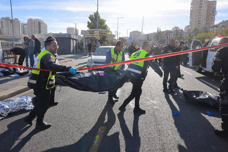 Le mouvement islamiste palestinien Hamas a revendiqué l'attaque à l'arme à feu qui a fait trois morts ce jeudi 30 novembre 2023 à Jérusalem et a appelé à une "escalade de la résistance" contre Israël (Photo AFP - Des secours israéliens enlèvent le corps d'un des deux agresseurs présumés sur le site de la fusillade)