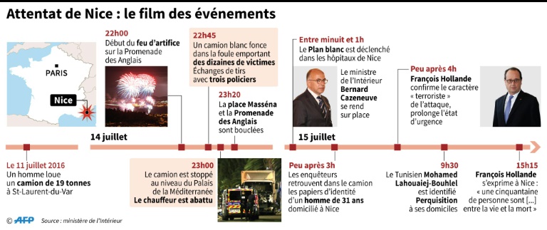 "Il m'a doublé à fond. Il roulait sur le trottoir. J'ai en tête les images des corps qui volaient de partout. J'ai tout de suite compris. (...) Ma femme, derrière moi, me tirait le bras et me demandait où j'allais. Je me suis arrêté. Je lui ai dit: dégage! Et j'ai accéléré à fond", affirme cet employé de l'aéroport de Nice qui, arrivé en retard au feu d'artifice, était venu sur la Promenade manger une glace avec sa femme.