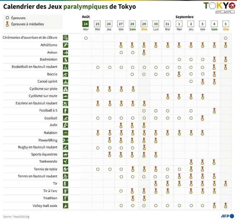 Cette dégradation a eu raison des gradins, décrétés vides dans le sillage des JO frappés de huis clos pour 98% des épreuves. Pour les 4.400 sportifs en lice, il n'y aura pas de public donc, mais leur objectif est ailleurs: décrocher l'un des 539 titres (contre 339 durant les JO) décernés jusqu'au 5 septembre. "C'est sûr qu'on préférerait qu'il y ait du public mais, nous, on reste concentré sur notre objectif. On a passé cinq ans cette fois à s'entraîner pour atteindre le graal", résume pour l'AFP la judokate et porte-drapeau française Sandrine Martinet, que les tribunes désertes des premiers jours de Rio il y a cinq ans n'avaient pas empêchée d'arracher enfin sa première médaille d'or.