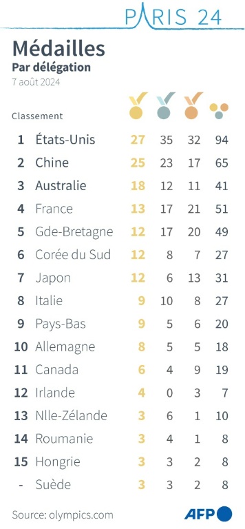 La France aborde cette douzième journée des Jeux au quatrième rang de la hiérarchie, avec 51 médailles dont 13 d'or.