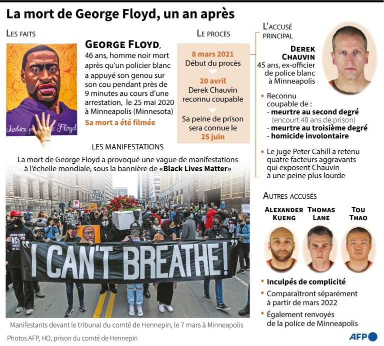 Tué le 25 mai 2020 à Minneapolis lors de son arrestation par quatre policiers, le quadragénaire afro-américain est devenu un symbole aux Etats-Unis et au-delà . Son supplice a provoqué une mobilisation inédite, son "Je ne peux plus respirer" s'est transformé en cri de ralliement contre les abus des forces de l'ordre.
