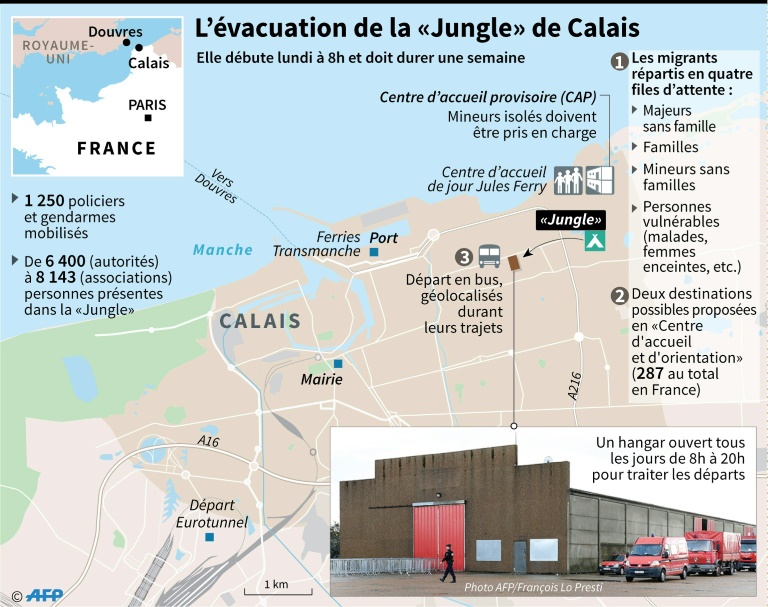 Lundi, 45 cars (contre 60 initialement prévus) ont acheminé 1.918 adultes de Calais dans 80 centres d'accueil et d'orientation (CAO) situés dans onze régions de France, selon le ministre de l'Intérieur Bernard Cazeneuve.