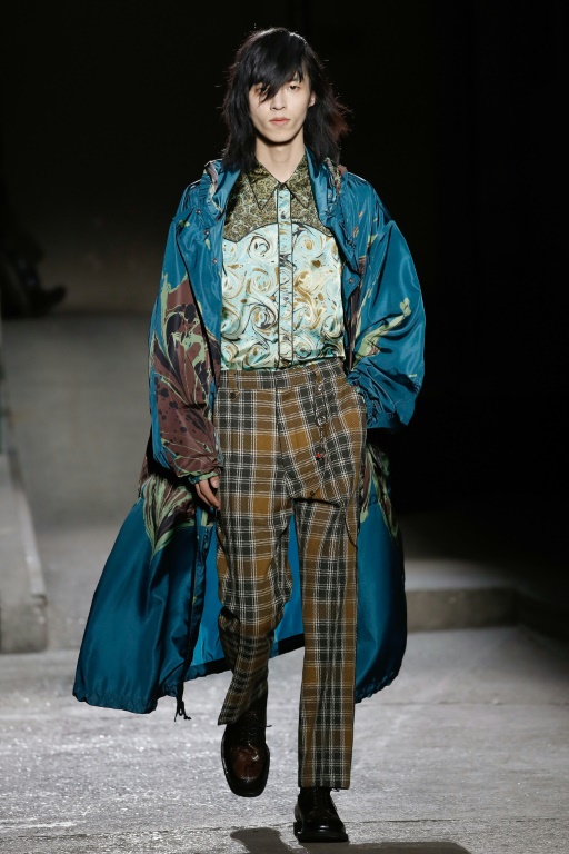 Chez Dries Van Noten, maître de la couleur, l'imprimé star est réalisé avec une technique de marbrage traditionnellement utilisée sur le papier, notamment pour les reliures de livres: bleu, kaki, chocolat s'entremêlent et semblent flotter sur des parkas légères comme des toiles de parachute.