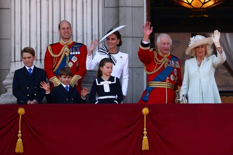 Vêtue d'un long manteau blanc et d'un chapeau, Kate, 42 ans, a d'abord parcouru le Mall en carrosse avec ses trois enfants - George, 10 ans, Charlotte 9 ans, et Louis 6 ans - jusqu'à la place Horse Guards Parade où s'est tenue la cérémonie, avant de rejoindre le palais de Buckingham et d'apparaitre sur le balcon avec le reste de la famille royale.