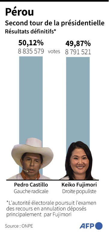 La fille de l'ex-président Alberto Fujimori (1990-2000), qui purge lui-même une peine de 25 ans de prison pour corruption et crime contre l'humanité, a multiplié les accusations de "fraudes" contre son adversaire. Elle a demandé l'invalidation de plusieurs dizaines de milliers de suffrages.