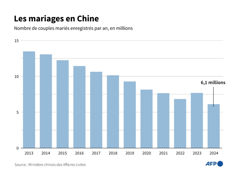 Le nombre de mariages a chuté de plus de 20% l'an passé en Chine, selon des statistiques officielles publiées lundi.