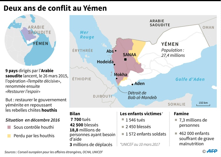 Depuis l'intervention de la coalition arabe, plus de 7.700 personnes, en majorité des civils, ont été tuées et 42.500 blessées dans le conflit au Yémen. Toutes les médiations de l'ONU et sept accords de cessez-le-feu ont échoué.