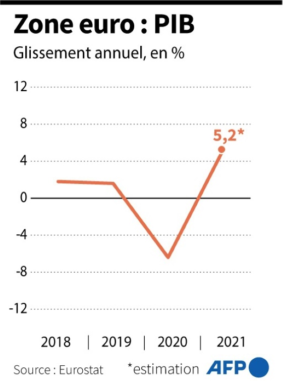 Le produit intérieur brut (PIB) de la zone euro a augmenté de 5,2% l'an dernier, comme dans l'ensemble de l'UE, en ligne avec les prévisions de Bruxelles, selon une première estimation publiée lundi par Eurostat.